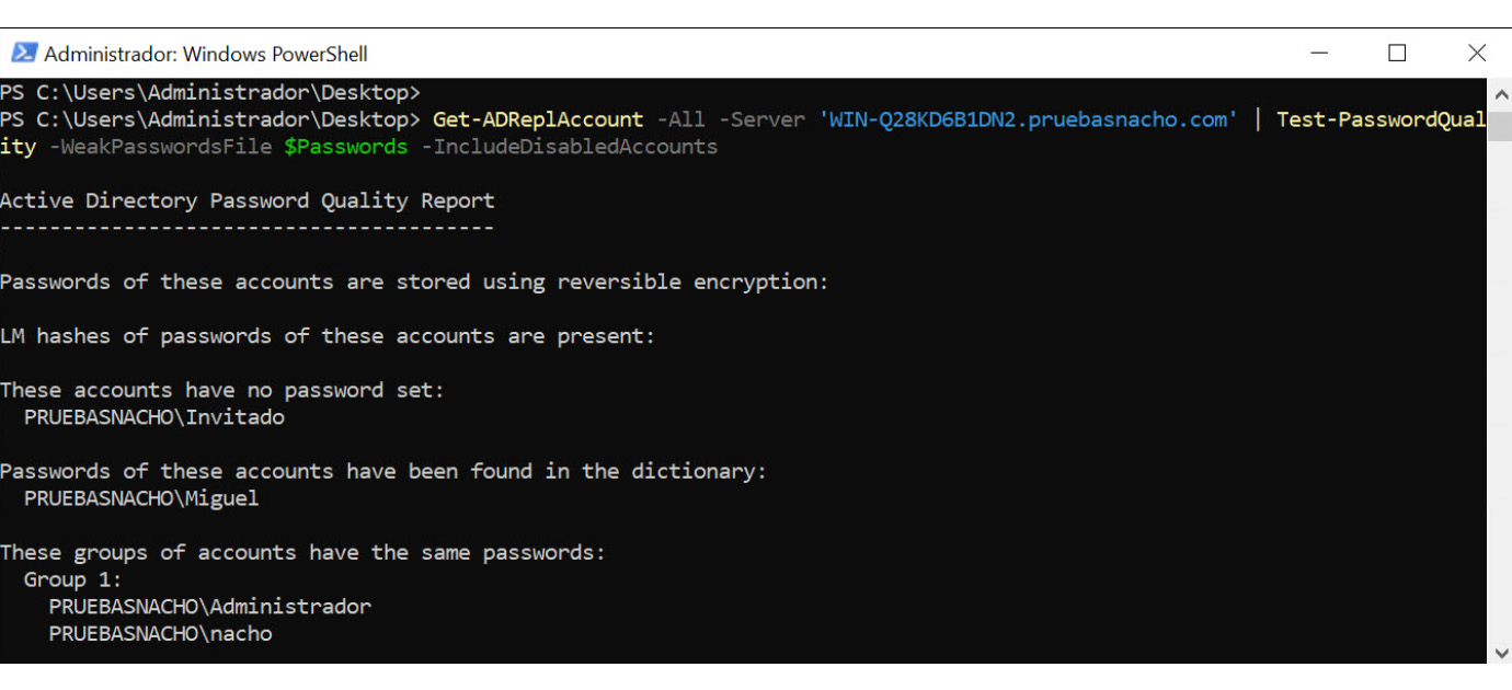 Get-ADReplAccount -All -Server ‘WIN-Q28KD6B1DN2.pruebasnacho.com’ | Test-PasswordQuality -WeakPasswordsFile $Passwords -IncludeDisabledAccounts