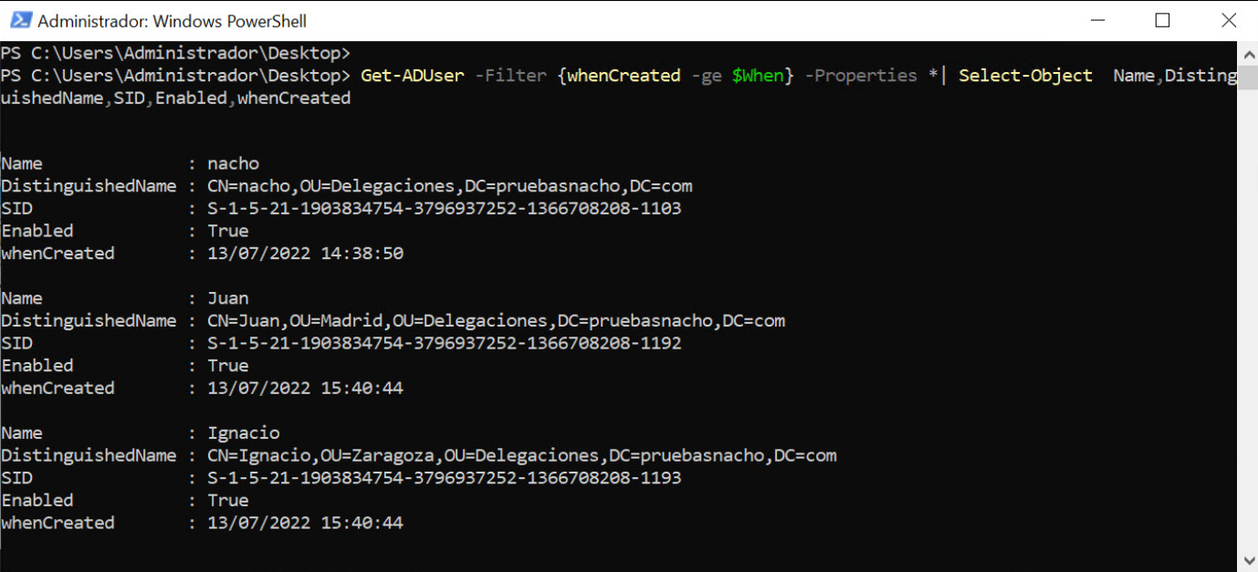 Get-ADUser -Filter {whenCreated -ge $Fecha} -Properties *| Select-Object Name,DistinguishedName,SID,Enabled,whenCreated
