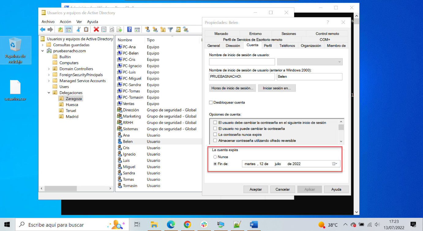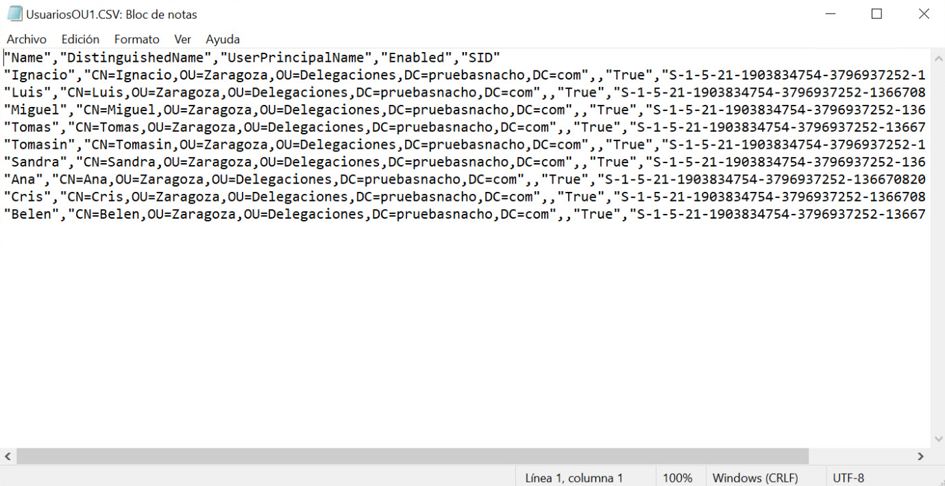 Get-ADUser -Filter * -SearchBase ‘ou=Zaragoza,ou =Delegaciones,dc=pruebasnacho,dc=com’ | Select-object Name,DistinguishedName,UserPrincipalName,Enabled,SID | Export-CSV “C:TempUsuariosOU1.CSV” –NoTypeInformation