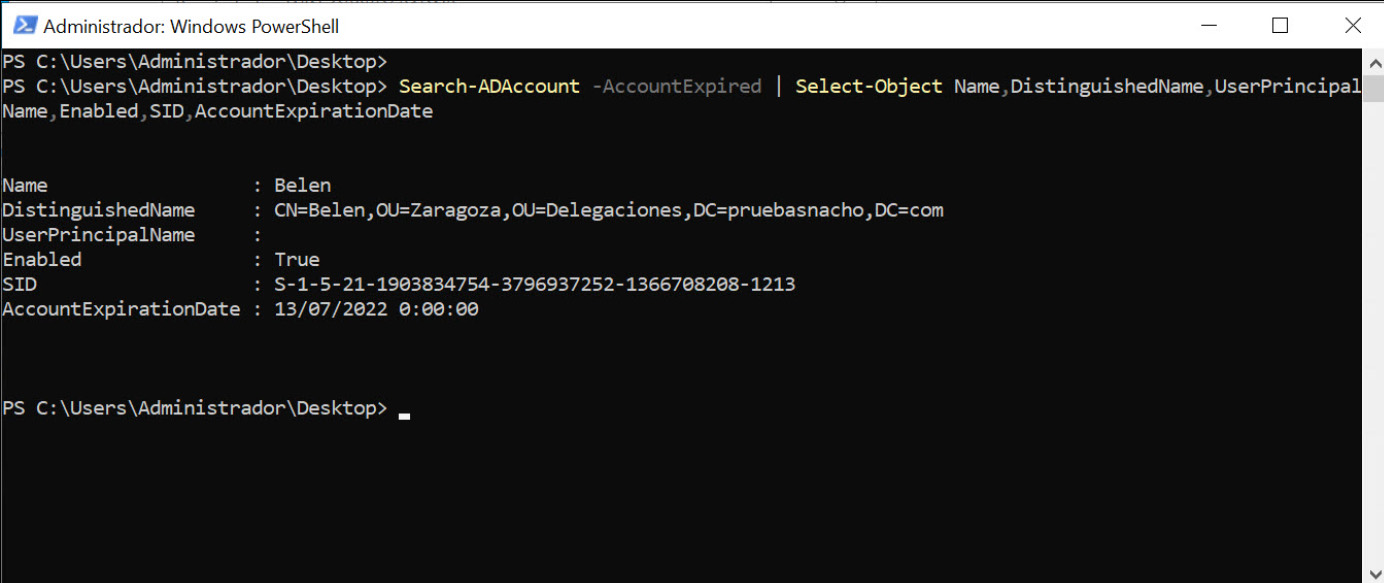 Imagem. Lista de contas de utilizador expiradas no nosso servidor AD DS com PowerShell