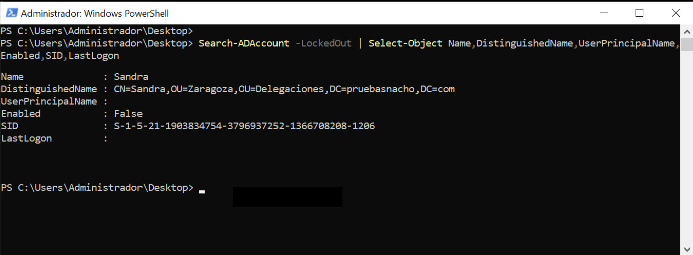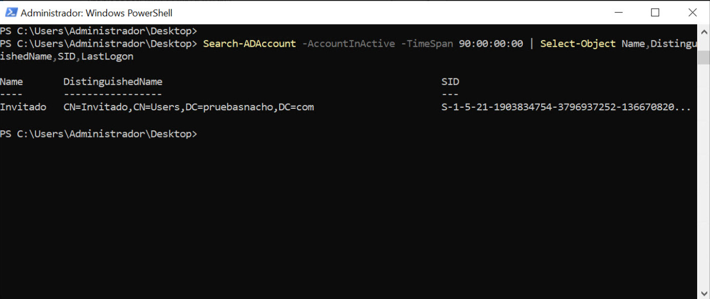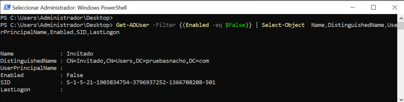 Neste caso, basta usar “Select-Object” para selecionar os campos que queremos que apareçam na consulta que estamos a fazer. Mais uma vez, para conhecer os campos, é recomendável executar o comando original sem modificadores para ver que informações podemos obter. Neste caso, podemos incluir o nome, conta, SID, etc. Além disso, pode ser interessante listar também o “LastLogon” para ver quando foi validado pela última vez no sistema.
