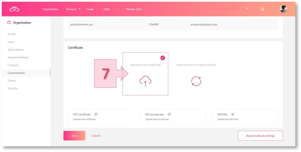 Once you have set the URL, you can now configure the digital certificate. If the company in question has a certificate, simply click on “Upload my own certificate” and add the Certificate, private key and PEM file (7).