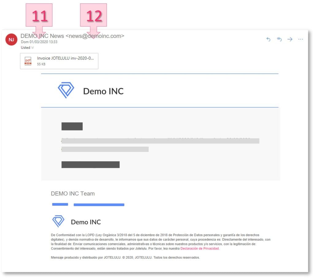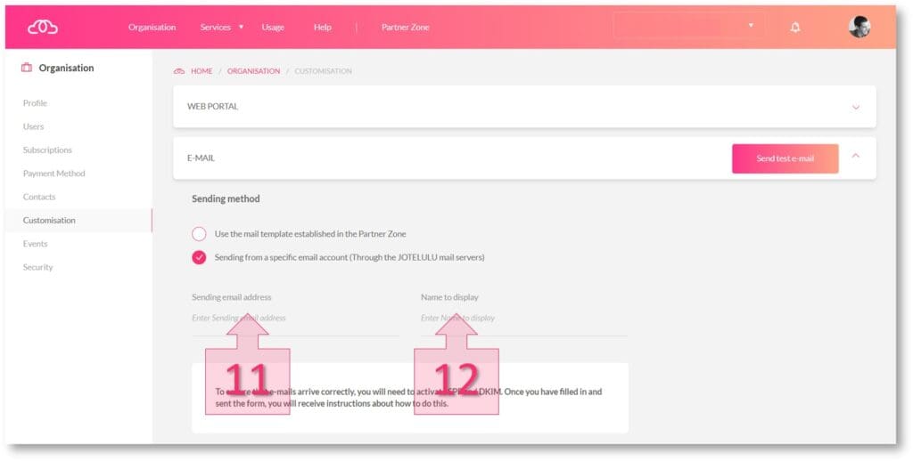 • Send from a specific e-mail account (through the Jotelulu e-mail servers). To do this, enter the new sender e-mail address (11) and the name that you want to be displayed (12). To ensure that notifications are sent correctly, you will need to activate SPF and DKIM. The process for doing this will be shown once the changes have been saved.