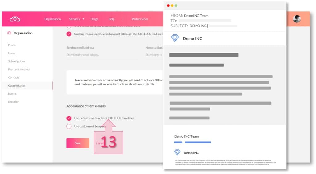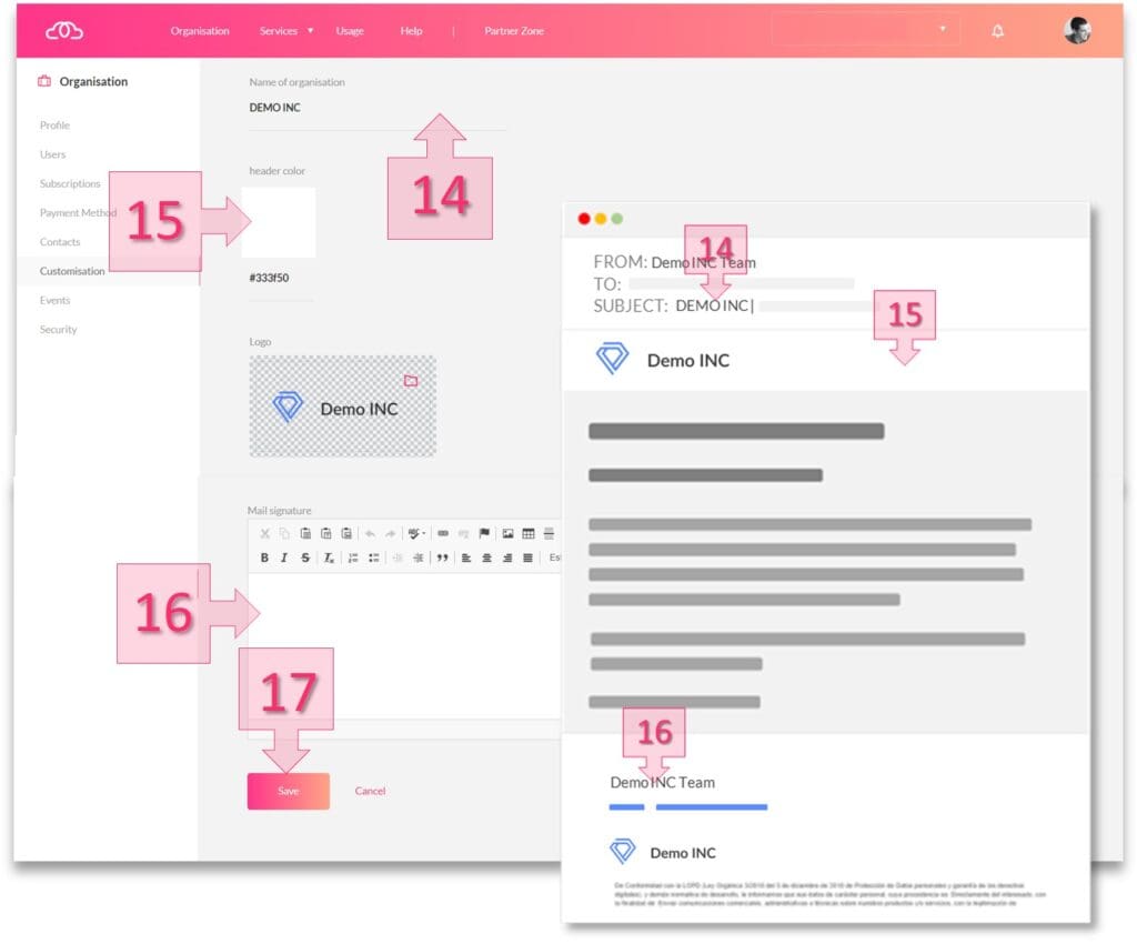 • A customised e-mail template. With this option, you can change the name of the organisation (14) that appears in the SUBJECT field, the header colour (15) and the e-mail signature (16).