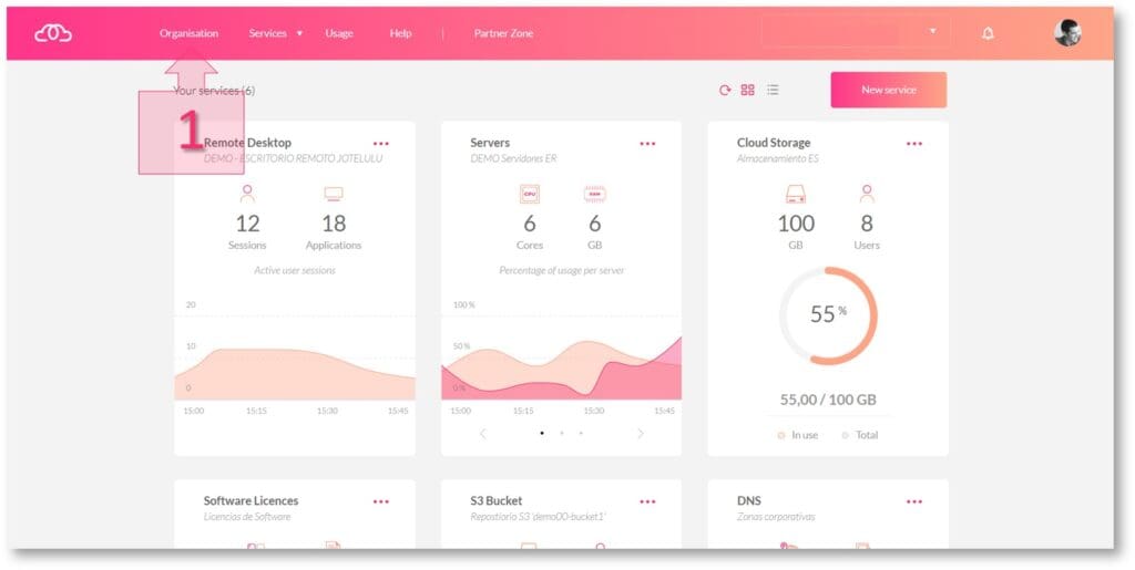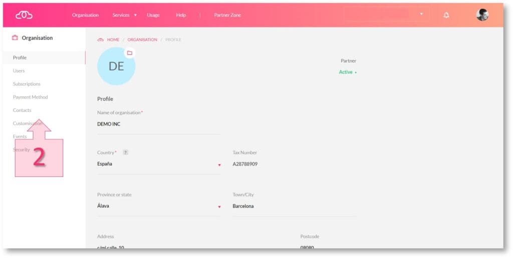 Once you have signed into the platform, click on “Organisation” (1) on the top menu.