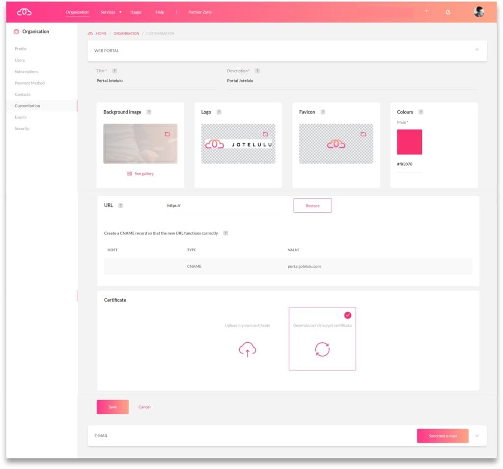 Once you have customised the appearance of the user portal, you will need to change the access URL (6). If the DNS zone is registered on the Jotelulu platform, a CNAME record will be automatically created so that the new URL will work correctly. If the DNS zone was not registered on Jotelulu, you will need to create a specific CNAME record on your DNS that points to portal.landings.jotelulu.com.