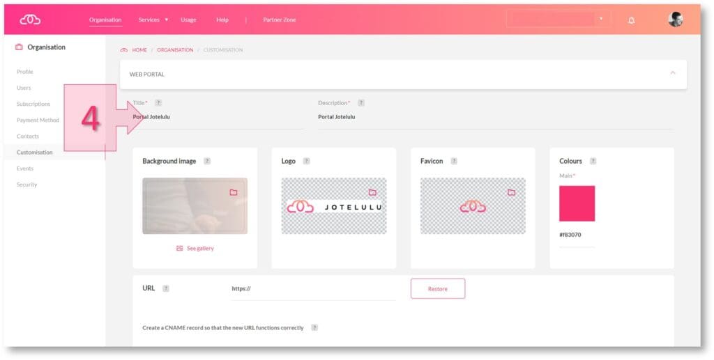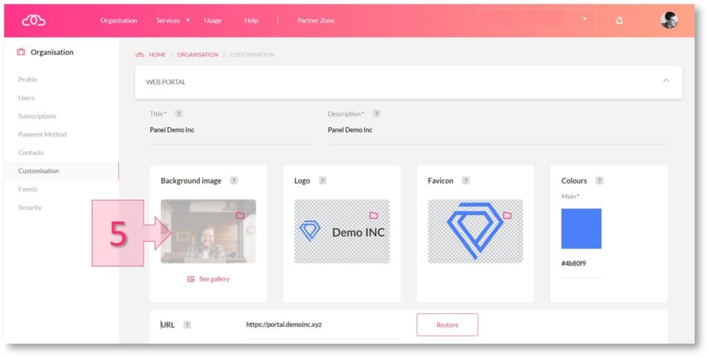 Once you have entered the title and description, you now have the option to upload a background imagelogo and favicon. You can also set the main colour (5) for the features on the portal (buttons, text and icons).