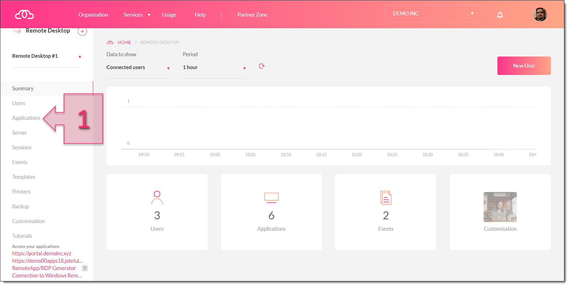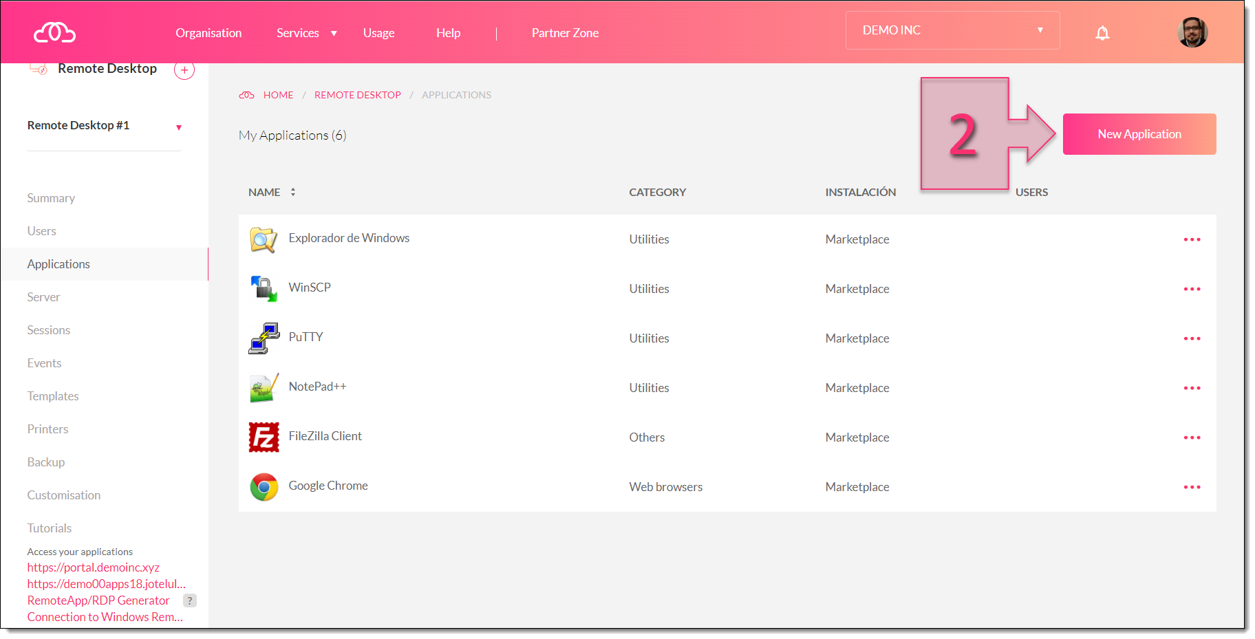 Once you have logged in to the Joteluu platform, open the Remote Desktop section and click on “Applications” in the left-hand menu (1).