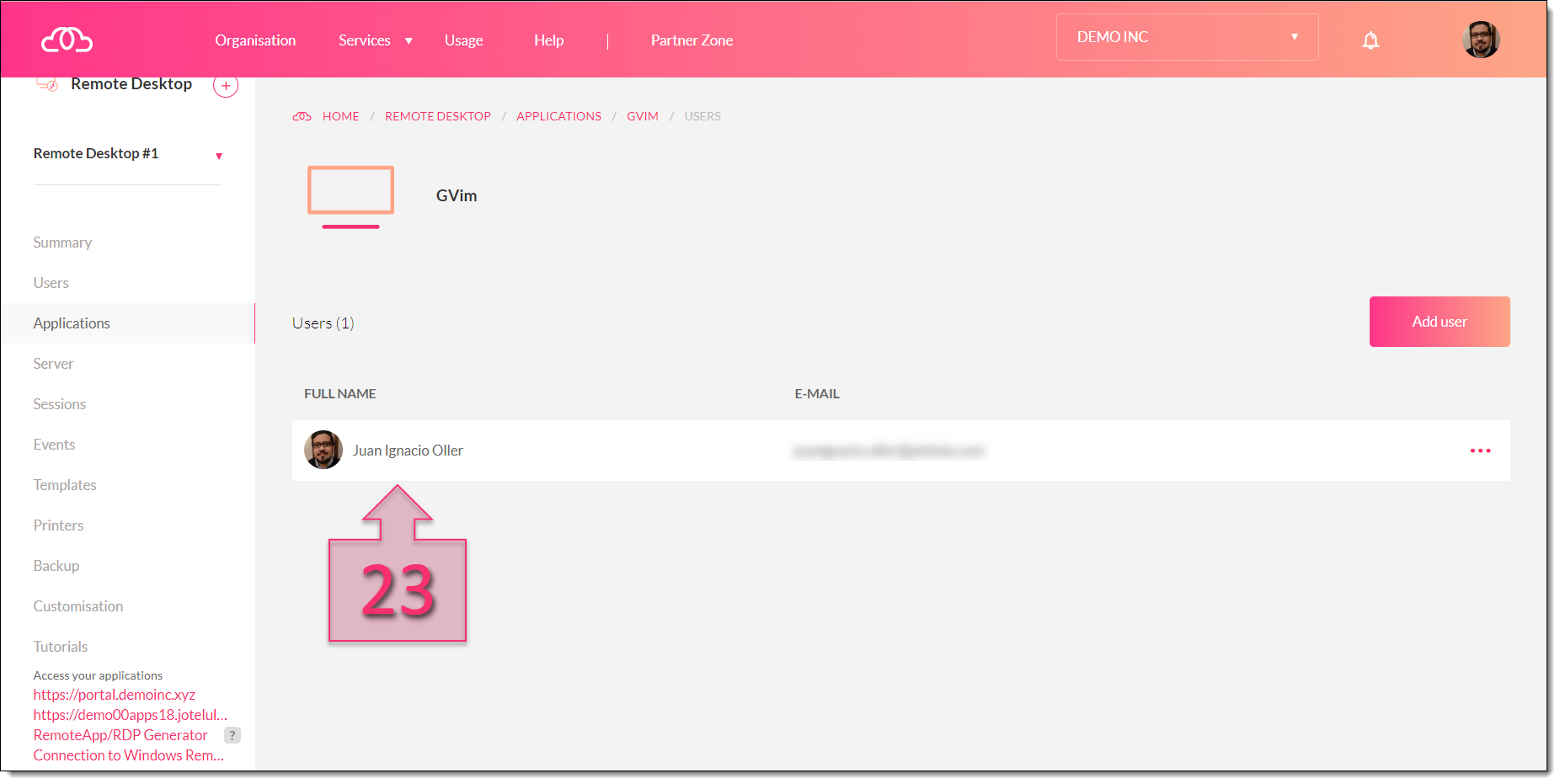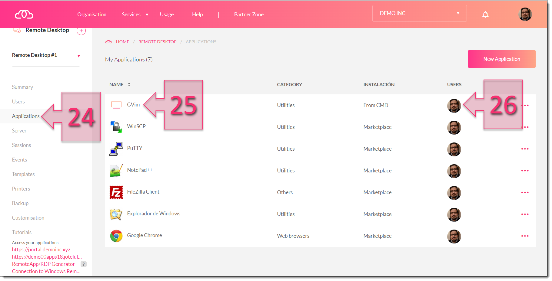 Having completed all these steps, return to the Applications section (24) and check that the new application is now available (25) and that the users (26) are displayed correctly.