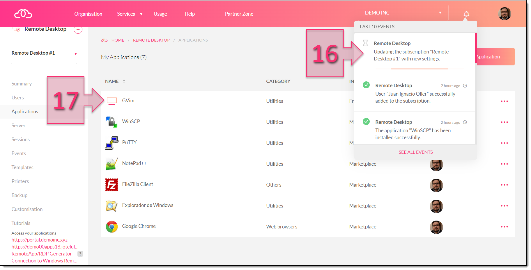 At this point, you will need to white while your new application is added to the server. If you click on the alerts icon in the top-right of the screen (16) you will be able to check its progress. Once this is complete, you will see the new application in your list of applications (17).