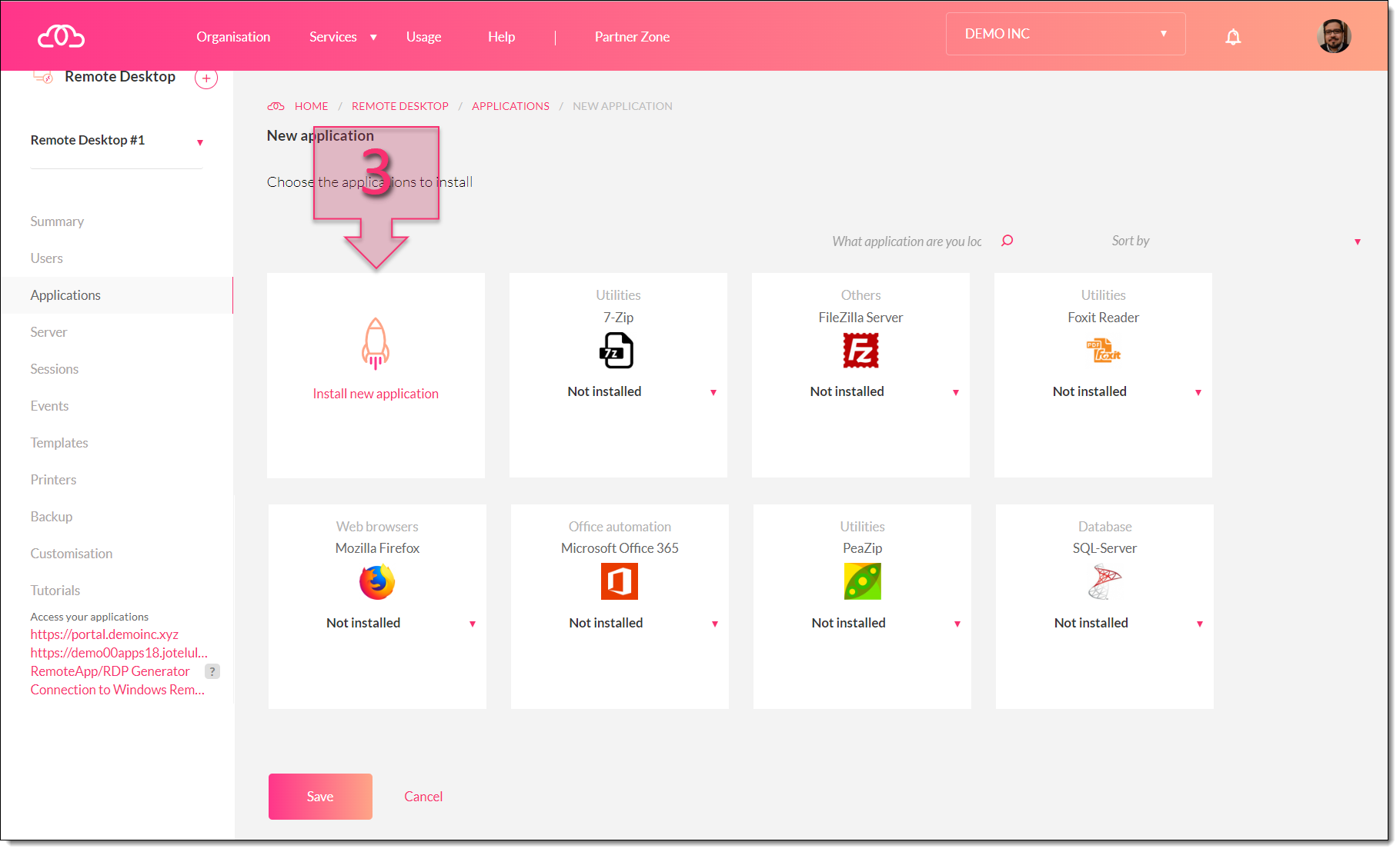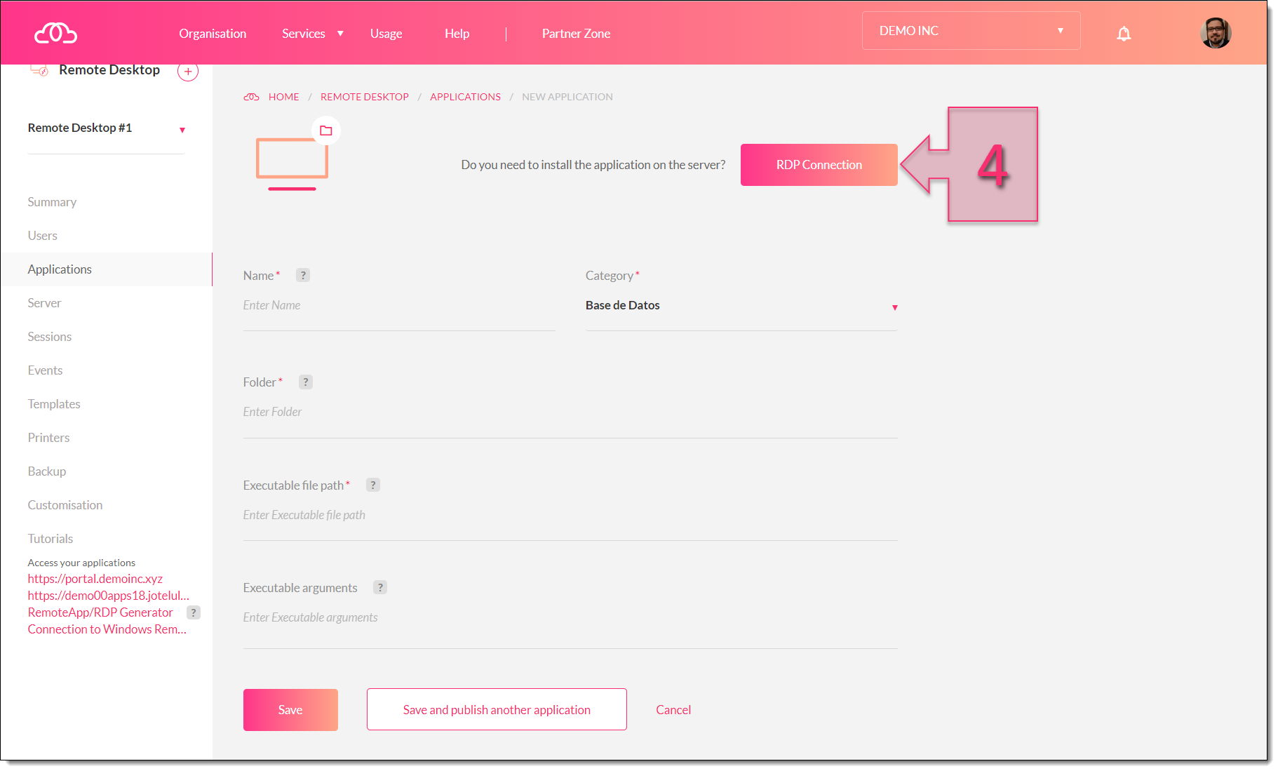 Instead, we have two options to install our new application. You can either use the classic RDP connection through Windows, or you can use the “RDP connection” button at the top of the page (4). This second option will open a web portal through which to establish the connection.