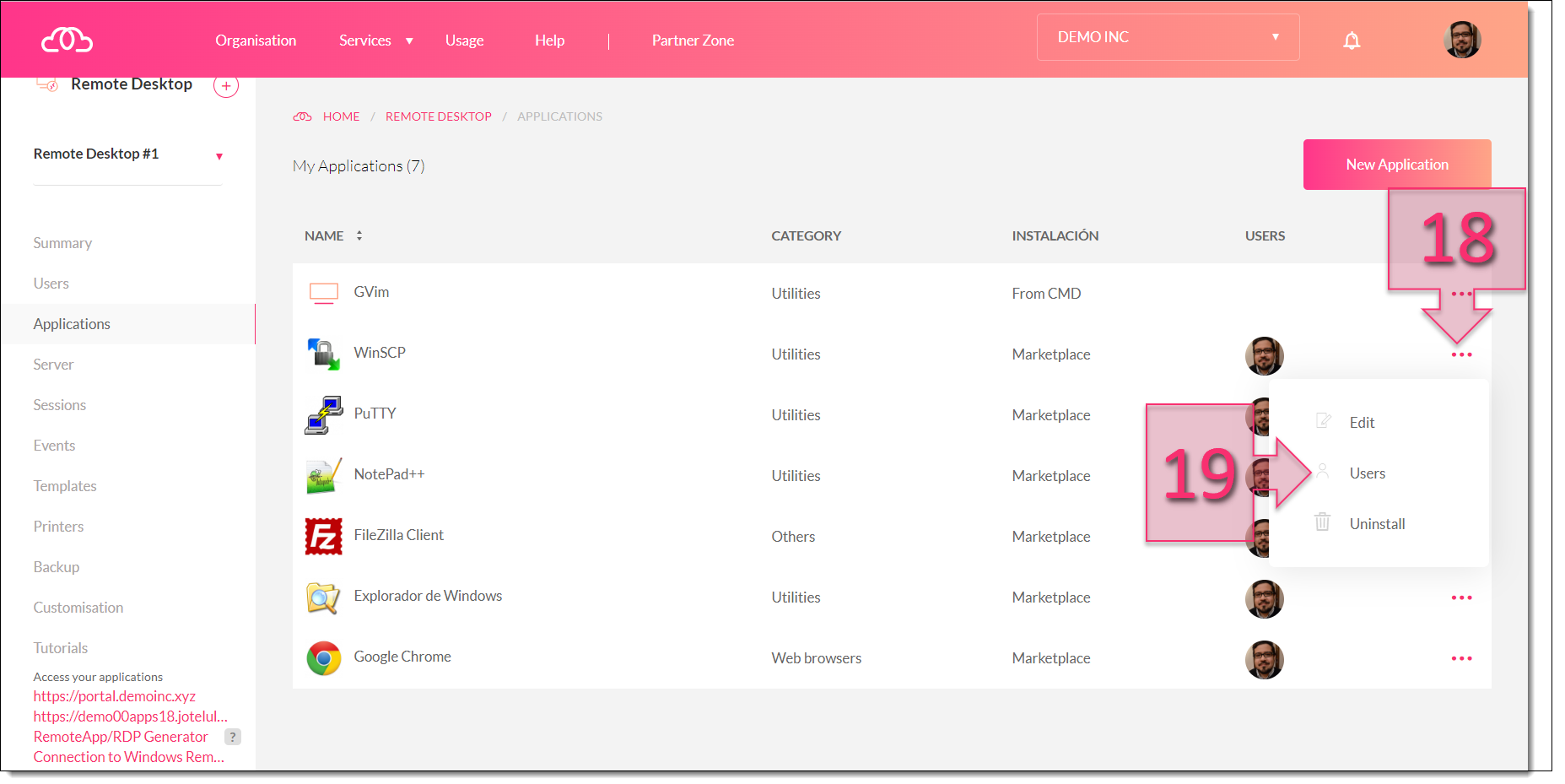 We now need to provide users access to the new application. To do this, click on the three dots next to the application (18) and click on “Users” (19).