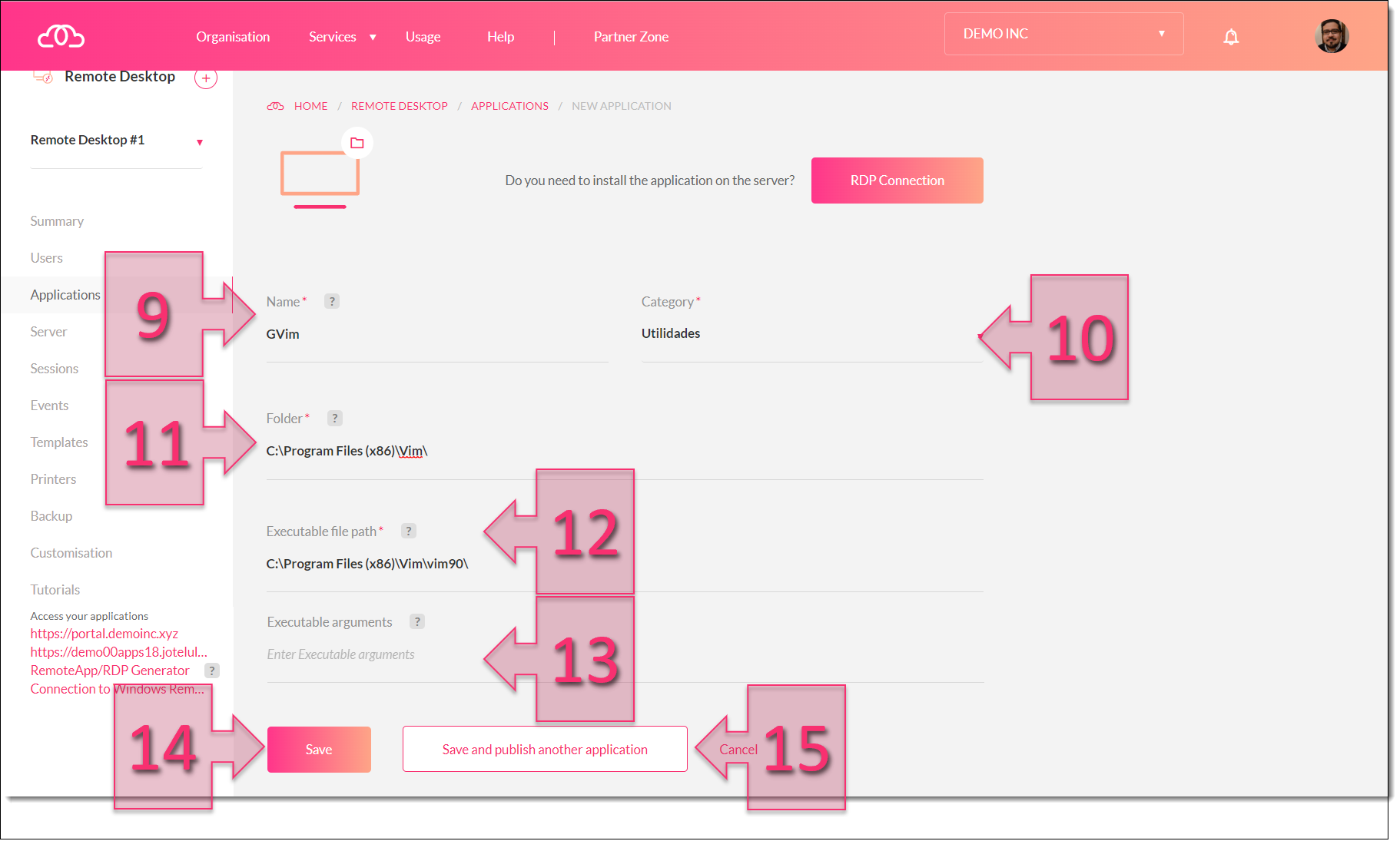 Once you have entered these details, click on “Save” (14) to apply your changes. If you want to add another application, click on “Save and publish another application” (15).