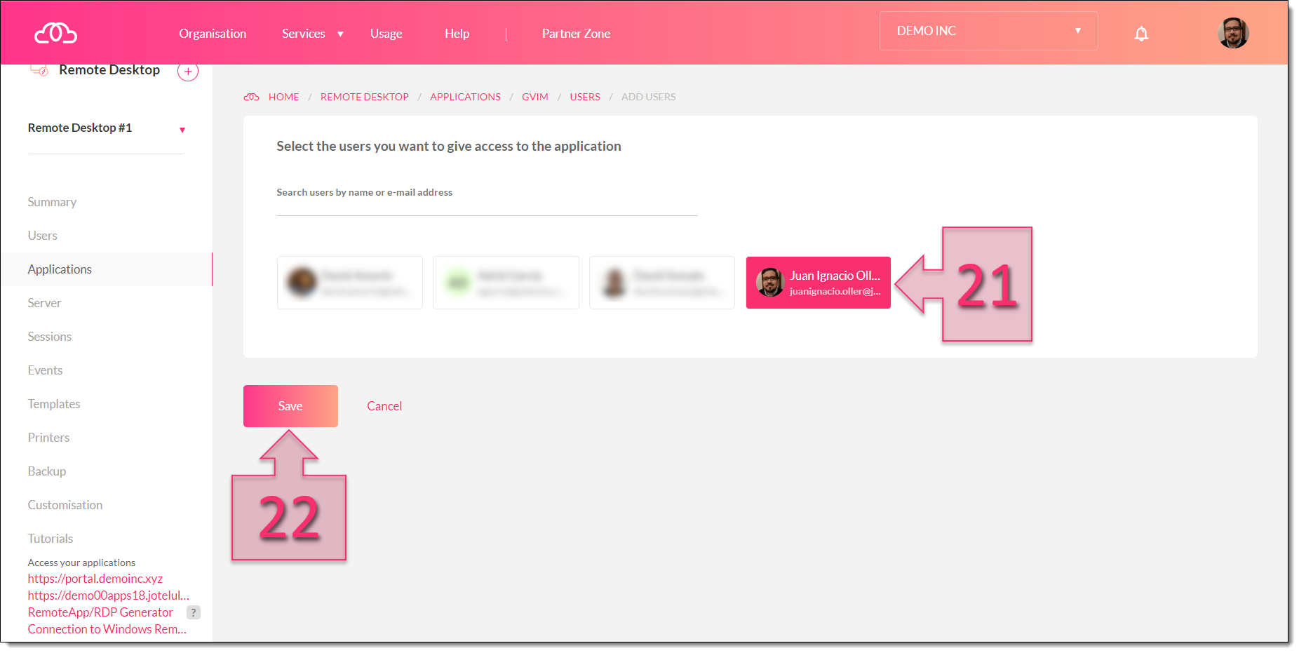 On the next screen, click on the users to whom you wish to provide access to your new application (21), then, click on “Save” (22).