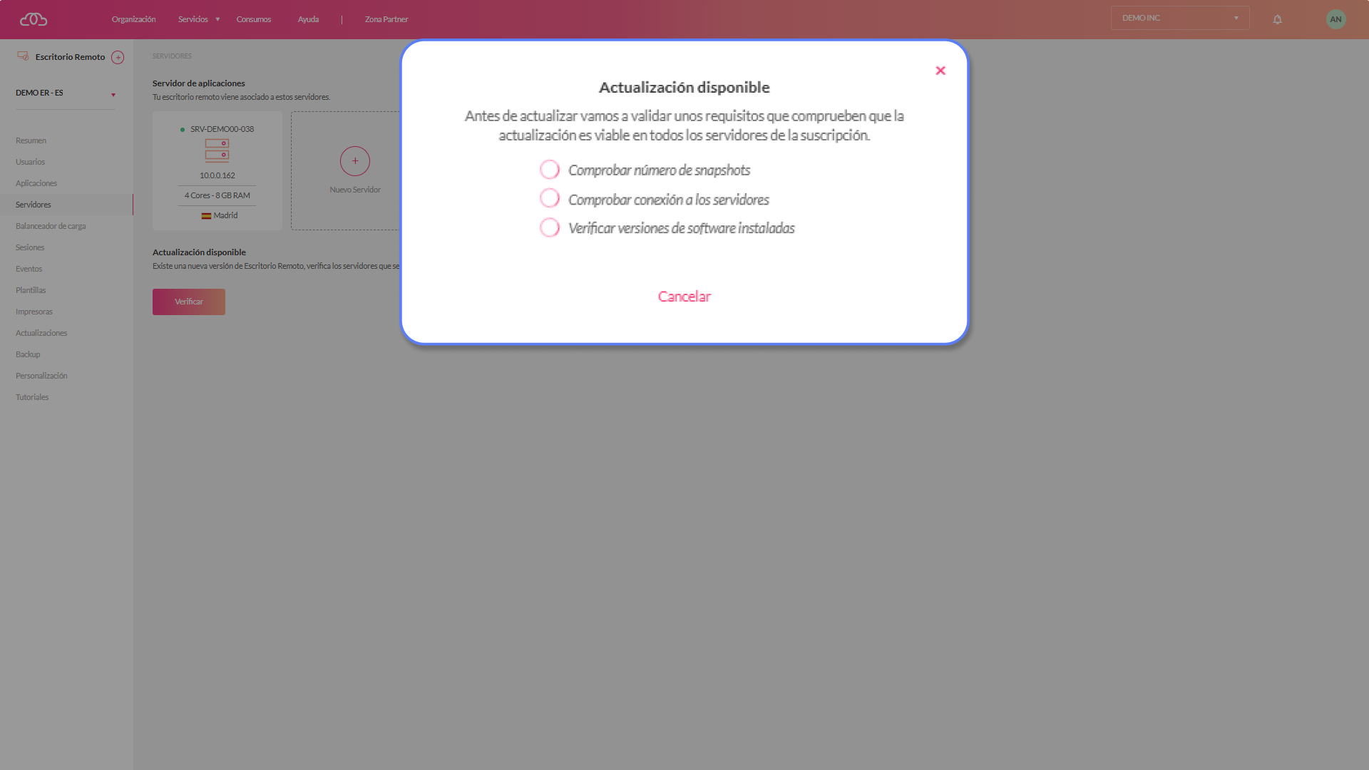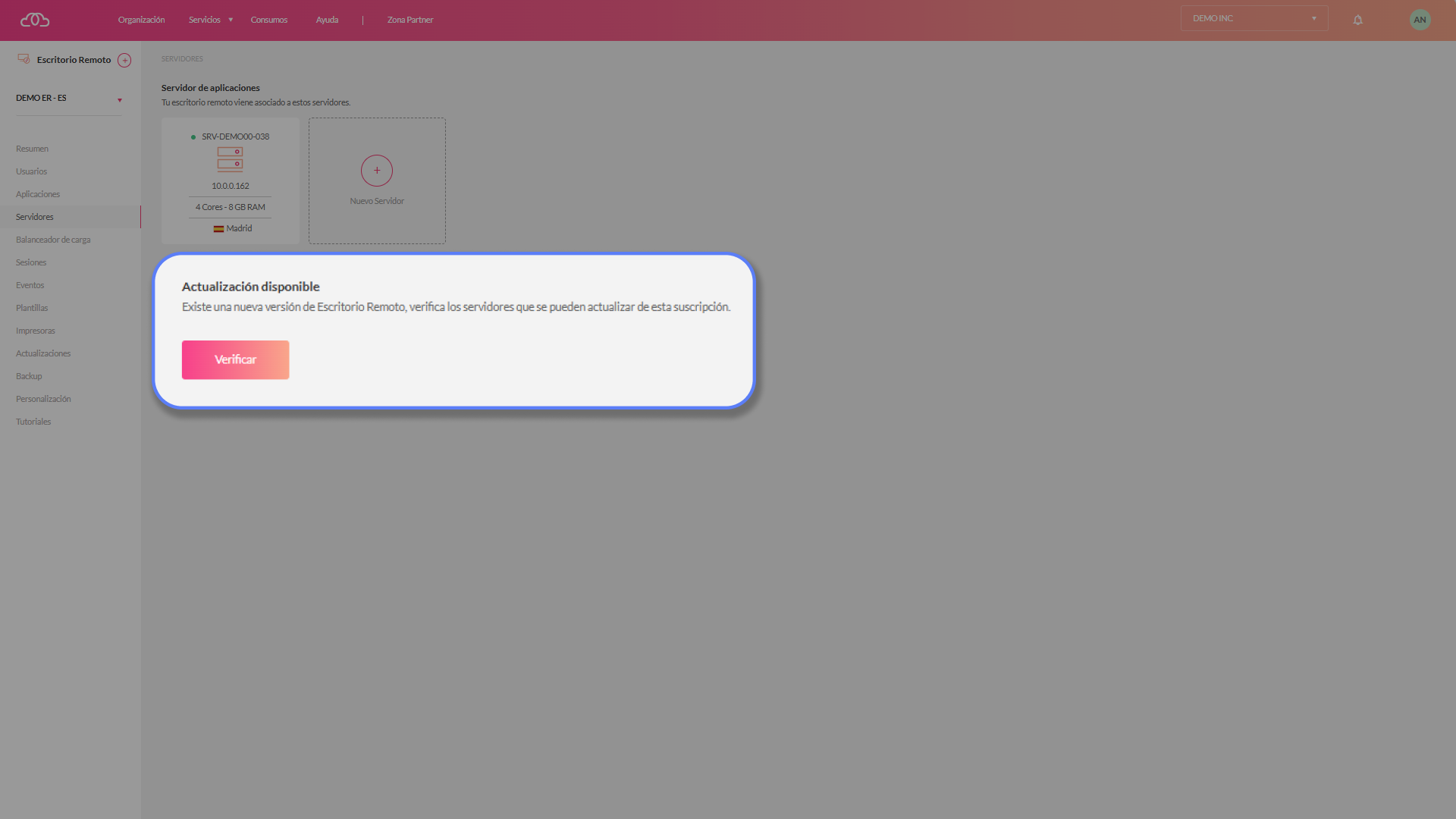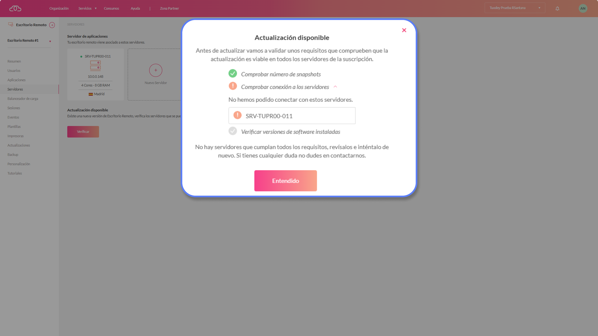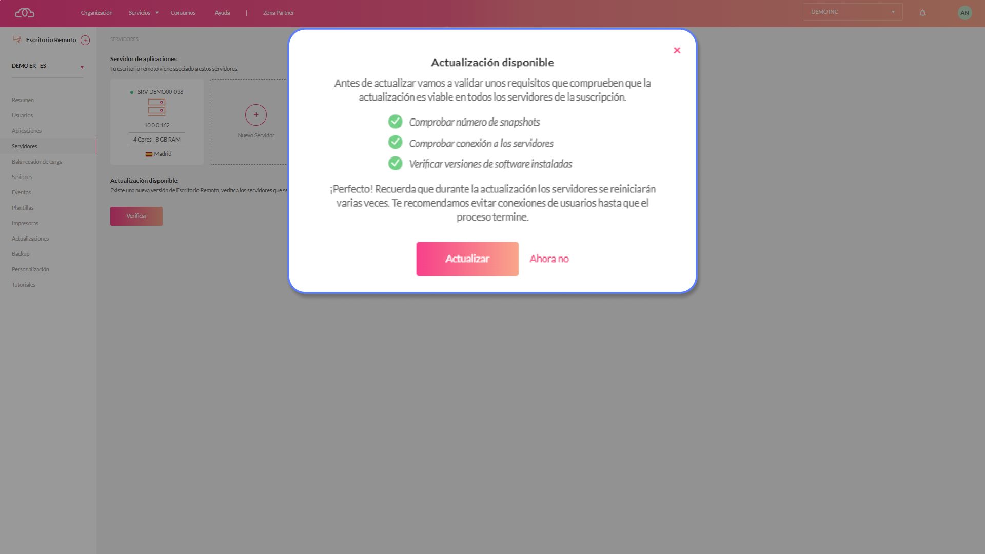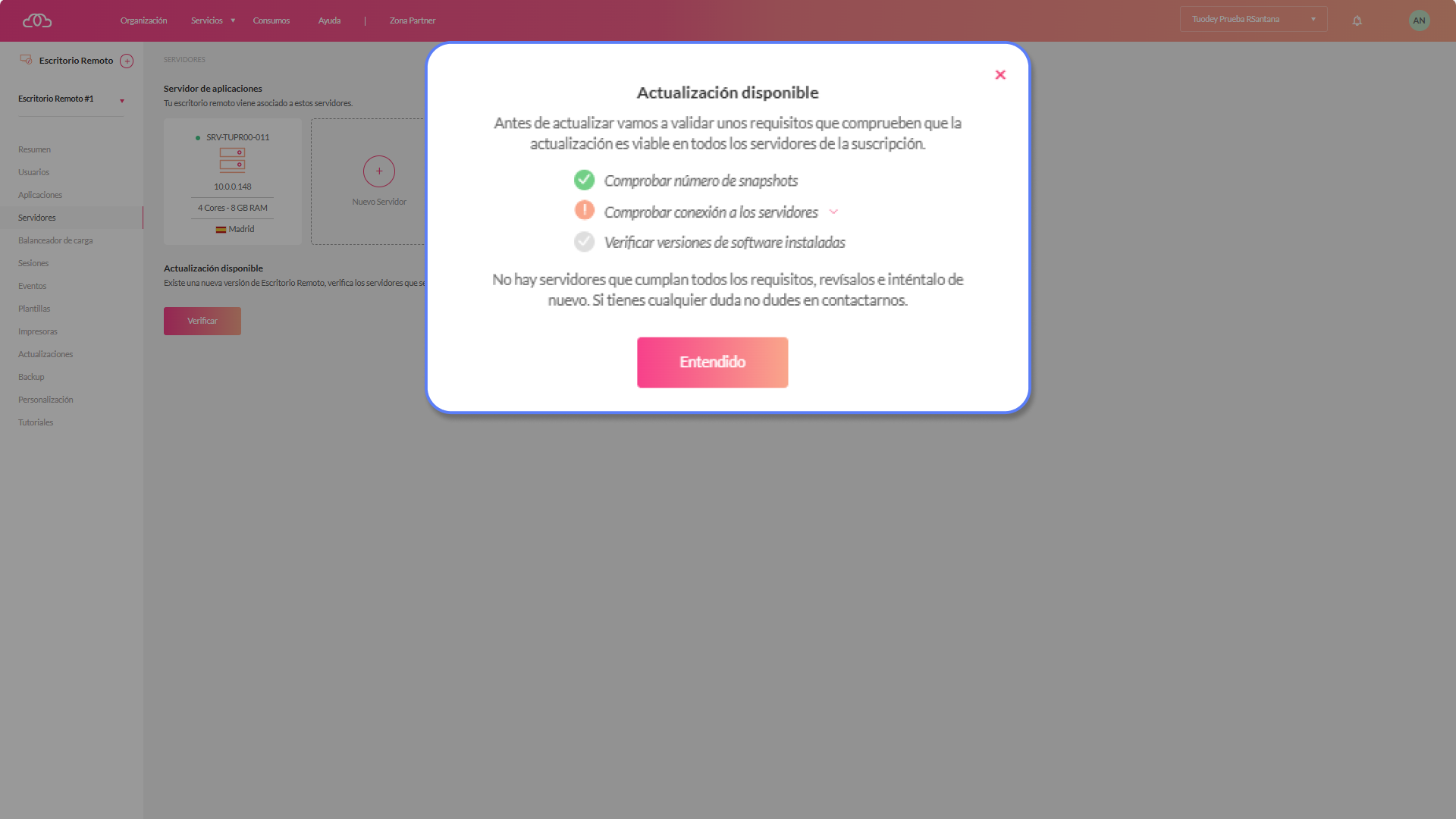 1.-Accede a la suscripción de tu escritorio remoto, debajo del servidor tendrás un botón que te indica que tienes una actualización disponible.
